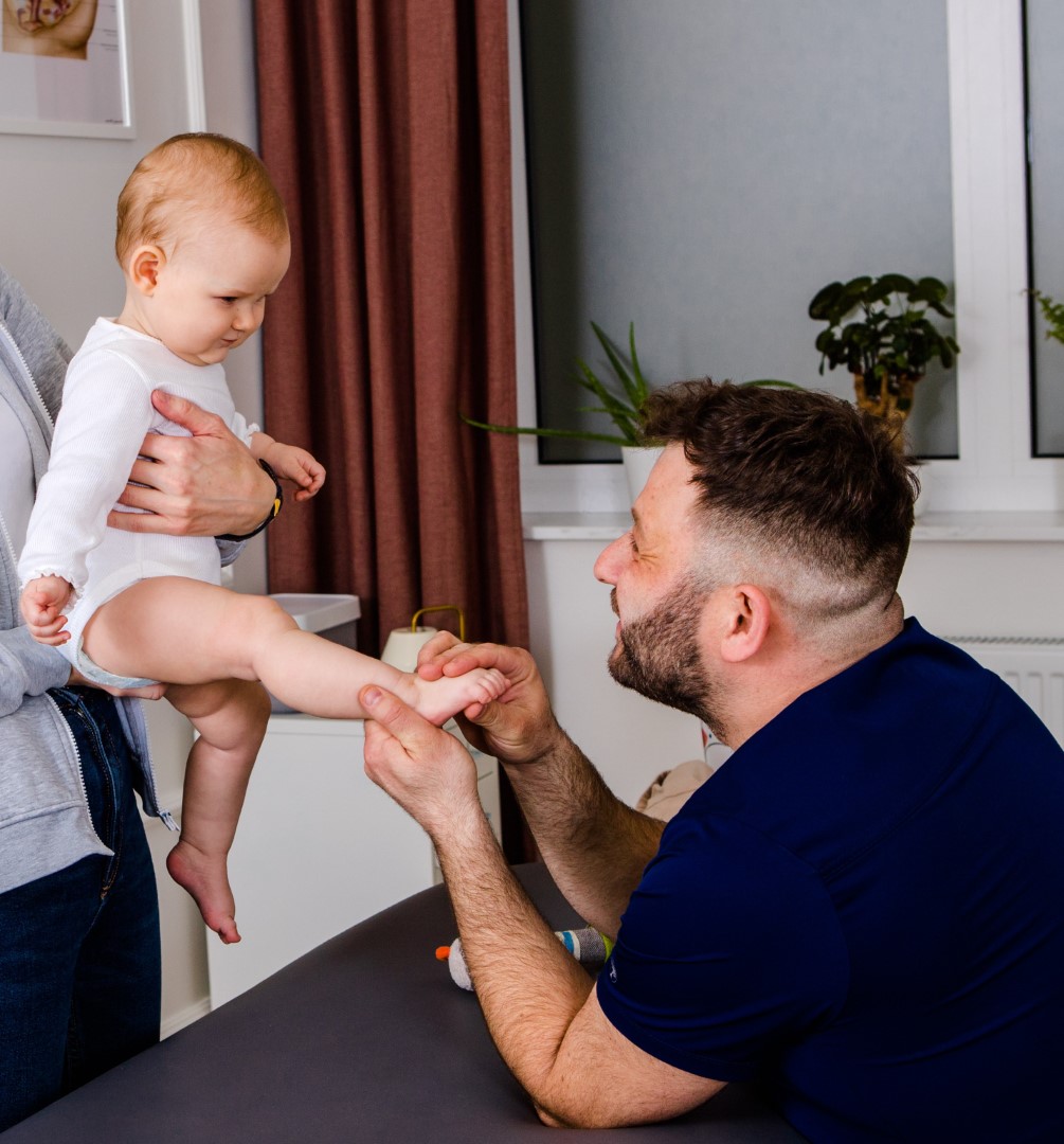 Fizjoterapia dziecięca to delikatna, bezbolesna terapia manualna, której celem jest wspieranie prawidłowego rozwoju malucha. Podczas badania oceniane są: napięcie mięśniowe, symetria ciała, jakość ruchu, odruchy oraz to, czy dziecko osiąga kolejne kamienie milowe w odpowiednim czasie. Szczególną uwagę zwraca się również na stan napięcia i ułożenie główki.